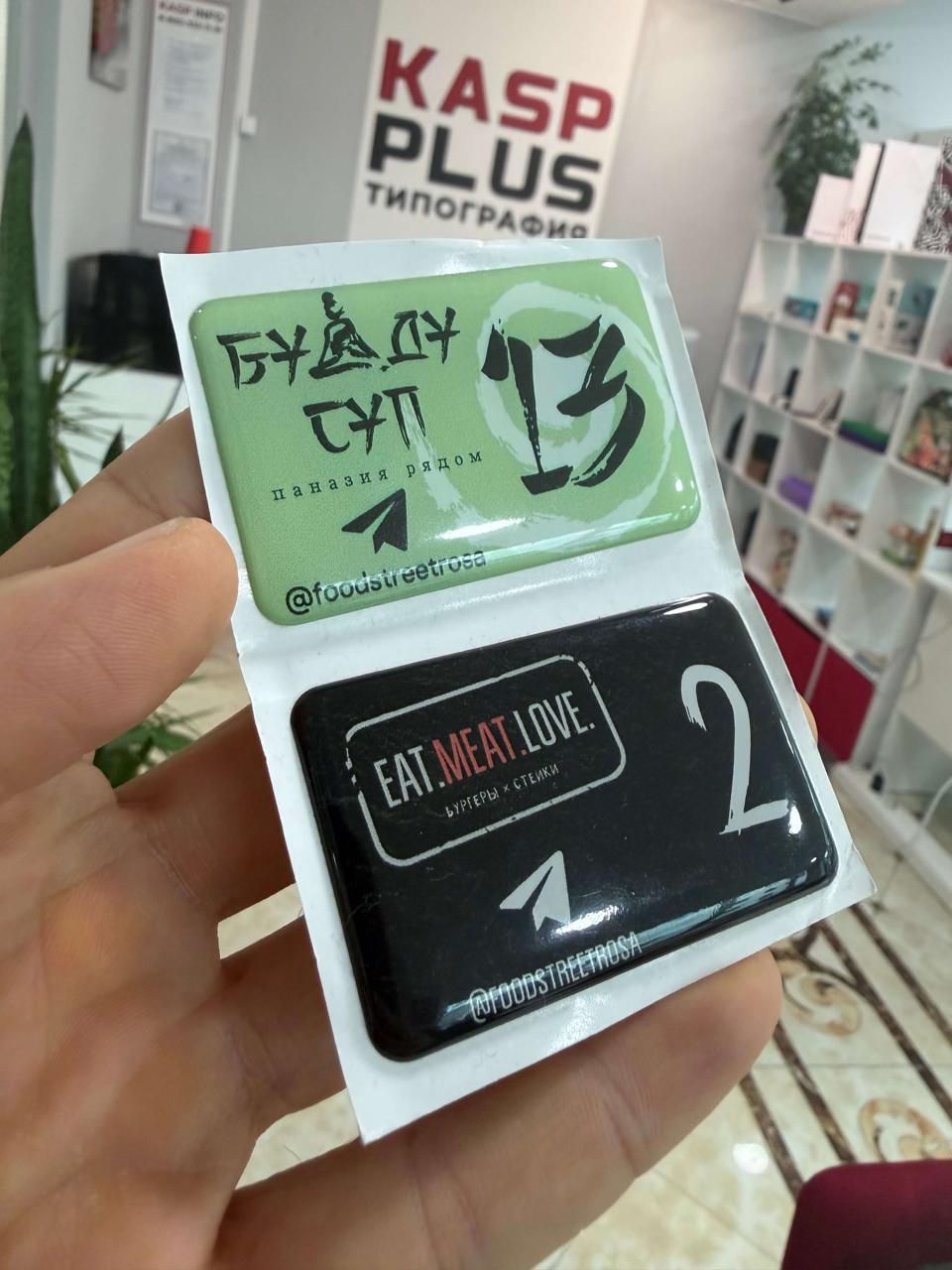 Объемные этикетки заливают прозрачной эпоксидной смолой, которая застывает в линзу и зрительно увеличивает изображение на 30–50%, делая цвета насыщеннее. Полимерный слой толщиной 1–5 мм придает 3D-эффект и защищает от царапин, влаги и УФ-лучей — срок службы до 5–10 лет на улице.